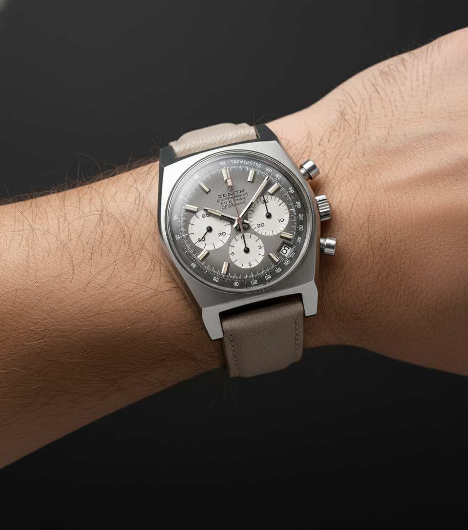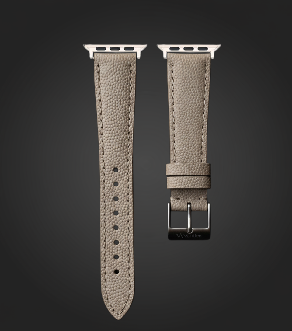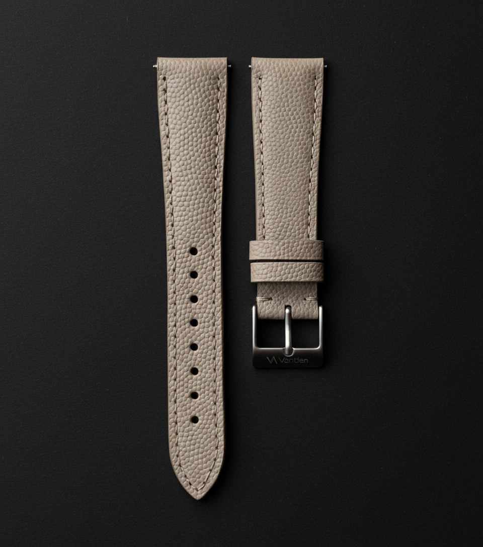 Our Dune Pebble strap is a quietly elegant option finished in a soft taupe tone that sits between beige and light grey. Crafted from premium pebbled calf leather, it features a fine, natural grain that adds depth and texture without overpowering the watch. Each strap is hand‑cut to keep the grain flowing neatly along the length, then stitched with matching thread and finished with smooth edges for a clean, tailored look. The neutral colour works effortlessly with silver, gold, and black cases, making it an easy everyday choice. As it breaks in, the leather softens and the raised pebbles pick up a gentle sheen, giving Dune Pebble a refined, lived‑in character.