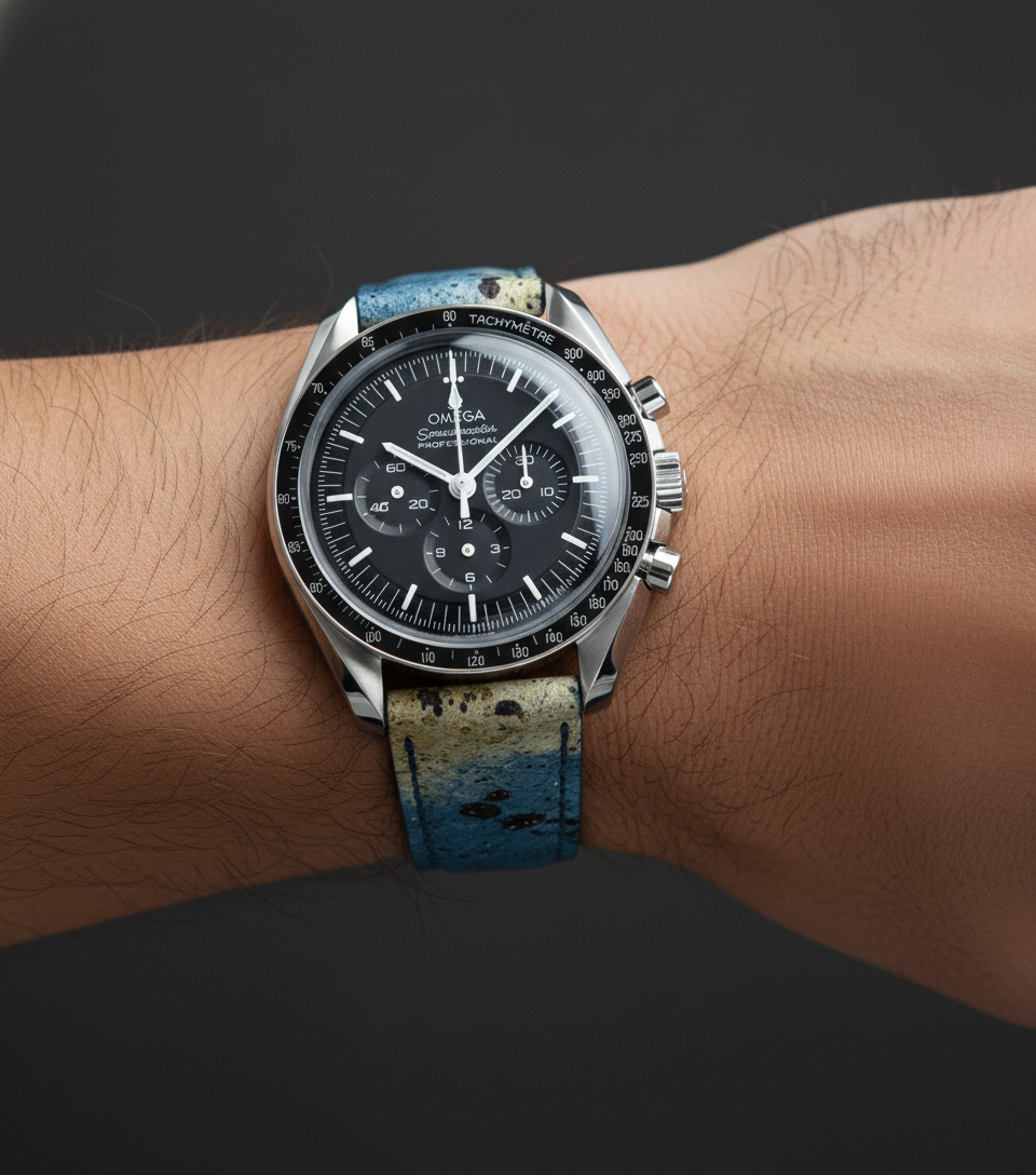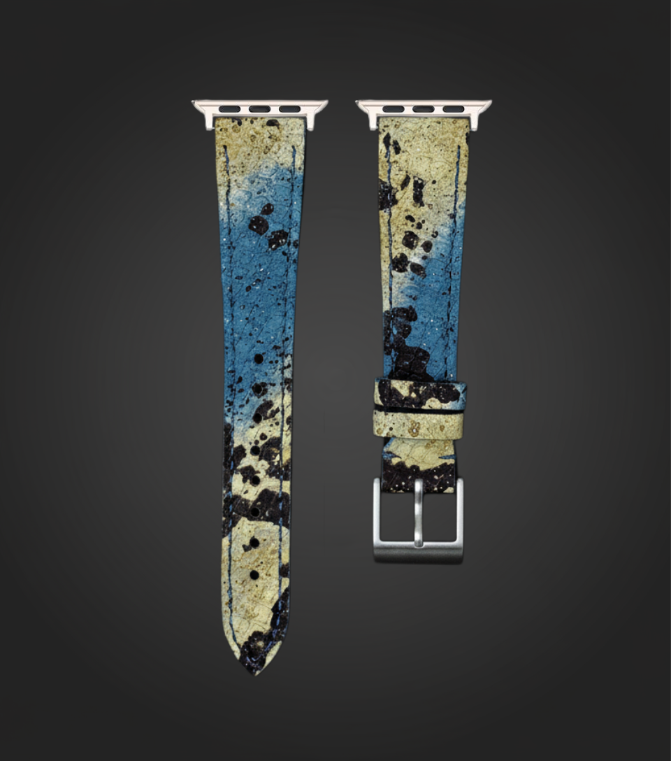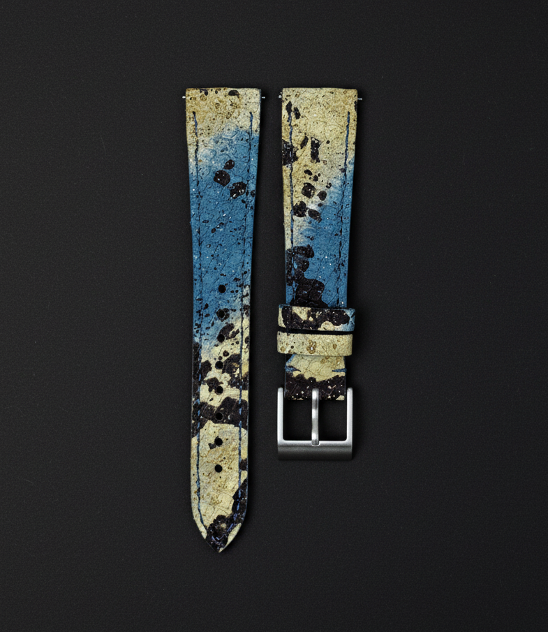 Our Horizon Python strap is for collectors who want something completely different. Crafted from genuine leather, it features a gradient of sandy beige into deep blue, finished with expressive black splatter detailing. The natural scales sit beneath this artistic finish, adding depth and texture that reward a closer look. Each strap is individually cut, so the pattern placement is unique every time. Hand‑stitched construction and carefully finished edges keep the strap wearable and balanced, while the leather gradually softens and develops a smooth sheen, turning the strap into a piece of wearable art on your wrist.